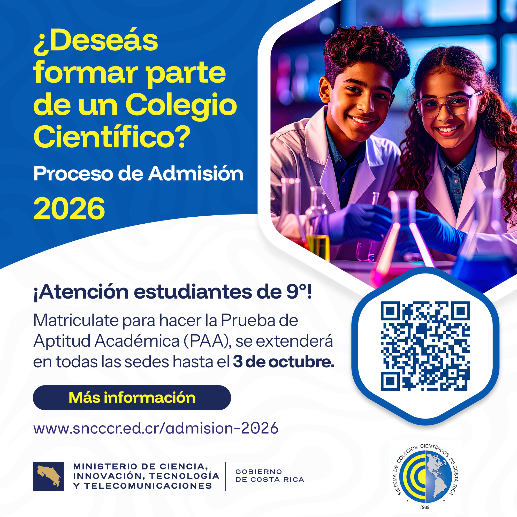 Como parte de los esfuerzos del Ministerio de Ciencia,Innovación, Tecnología y Telecomunicaciones (MICITT) por fortalecer las competencias de nuestros jóvenes en el campo científico, nos permitimos poner en su conocimiento que el proceso de matrícula para la Prueba de Aptitud Académica de ingreso 2026 a los Colegios Científico se tiene abierto hasta el próximo 03 de octubre del 2026.