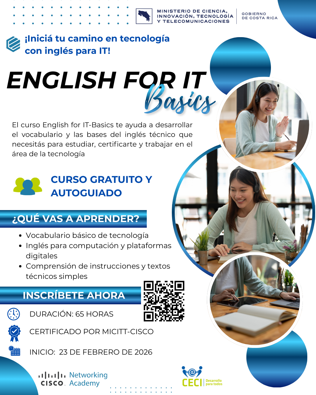 El MICITT, a través del Programa Nacional de Centros Comunitarios Inteligentes (CECI) y en alianza con Cisco Networking Academy, invita a participar en el curso “English for IT–Basics”, dirigido al público en general, personas mayores de 15 años. Este curso …